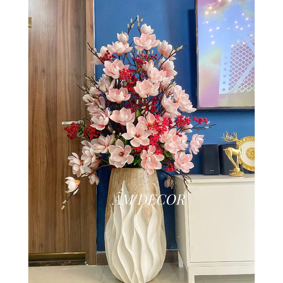 Bình hoa đại sảnh Inari là sự kết hợp hài hòa giữa nét ngọt ngào và sự nồng nàn. Hồng mang đến cảm giác lãng mạn, dịu dàng, trong khi đỏ tượng trưng cho may mắn, sang trọng và quyến rũ. Sự hòa quyện này tạo nên một tổng thể vừa tinh tế, vừa nổi bật, giúp không gian thêm phần ấm áp và đẳng cấp.