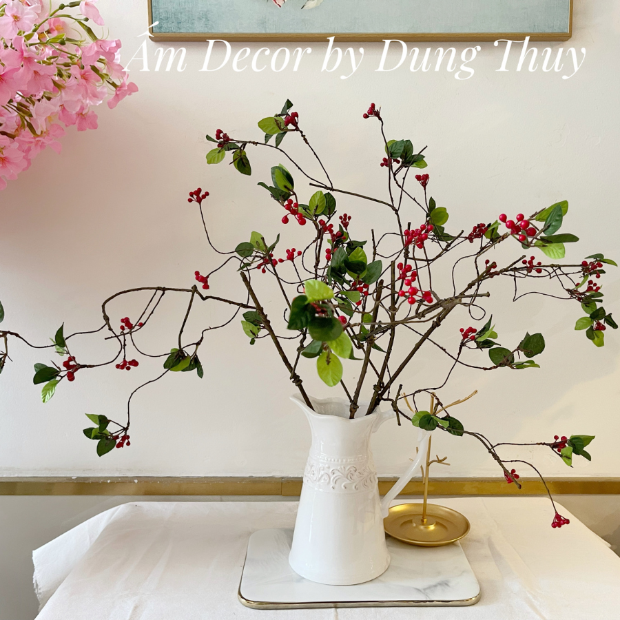 - Bình sứ có quai kết hợp cùng cành sơri đơn giản , tinh tế