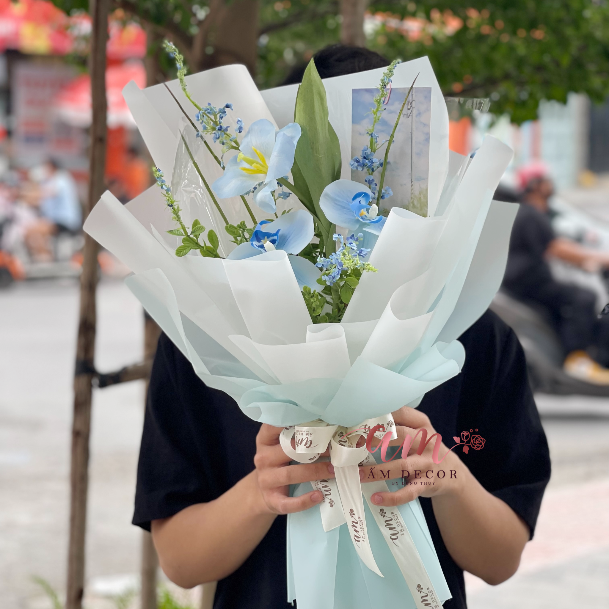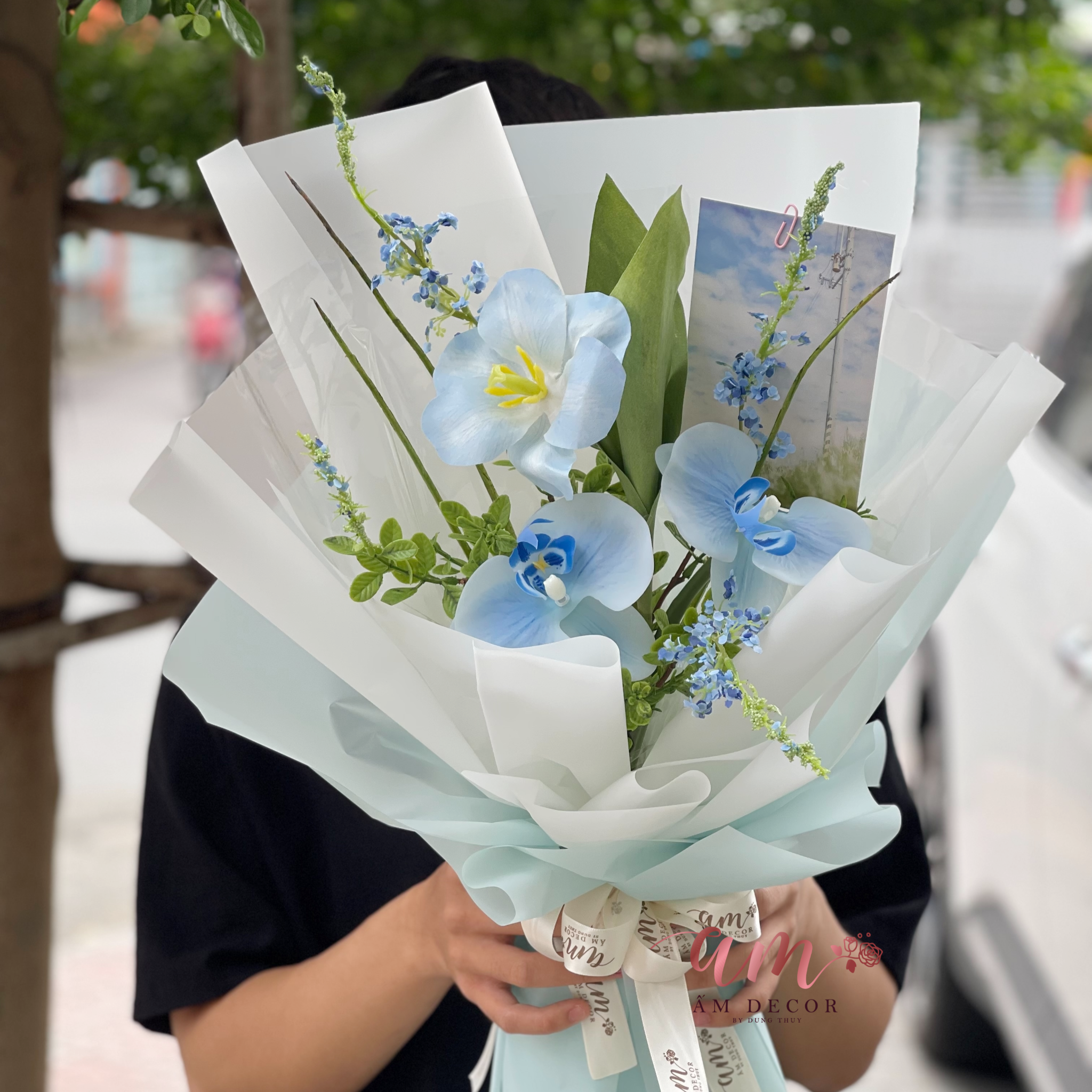 Mang sắc xanh dịu nhẹ, được phối khéo léo giữa những cánh lan hồ điệp xanh lam, hoa tulip xanh lạ mắt cùng những nhành hoa nhỏ li ti, tạo nên cảm giác vừa tinh khôi vừa gần gũi. Không chỉ là bó hoa, mà còn là lời nhắn gửi mộc mạc, chứa đựng sự chân thành và ấm áp dành tặng cho người nhận.